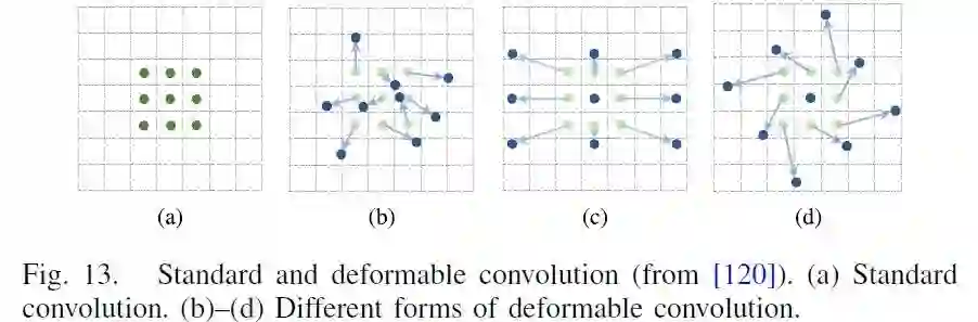 除了语义分割,扩张卷积在目标检测、显著性预测、光流、音频生成等任务上都得到了广泛的应用。受到人类视觉系统中感受野特性的启发,Liu 等人 [117] 提出了感受野模块 (RFB)。该模块结合 Inception 结构和空洞卷积,来模拟视觉神经细胞感受野的大小与偏心率之间的正相关关系。Li 等人 [118] 为了使网络在不同的尺度对不同大小的目标具有统一的特征表示能力,提出了 TridentNet,该网络使用具有不同扩张率的扩张卷积构建了多个分支,不同的分支具有不同的感受野,提取不同尺度的特征。作者还借鉴了 SNIP 中的尺度感知思想,为不同分支分配了对应尺度的目标标签。 尽管扩张卷积具有很多优点,但是在对其进行连续使用时,如果对扩张率选择不当,比如所有层使用相同的扩张率,那么某些像素便会始终无法参与运算,造成局部信息的缺失,Wang 等人 [119] 将其称为“网格化”。为此,他们提出混合扩张卷积 (HDC) 来作为该问题的解决方案。HDC 致力于让经过一系列卷积操作后的感受野完全覆盖正方形区域,不存在孔或者边缘的缺失。在 HDC中,扩张率设计为以组为单位的锯齿状的结构,然后对不同组进行重复,如 [1, 2, 5, 1, 2, 5]。除此之外,同一组的扩张率不应该有大于1的公约数,这一点与 [112] 具有关键的区别。 Dai 等人 [120] 对扩张卷积进行推广,提出了可变形卷积,通过引入额外的偏移量来增加网络中的空间采样位置。在输入特征图上应用额外的卷积层来获得这些偏移量,并在训练过程中对其进行学习。可变形卷积的感受野可以根据目标的尺度和形状进行自适应调整,从而实现多尺度的密集特征提取。与可变形卷积相似的一个工作是主动卷积 [121],该方法可以定义不同形式的卷积,并且通过反向传播来学习其形状。二者的主要区别在于,主动卷积中的偏移量是在每次训练时都要重新进行学习的静态模型参数,而可变形卷积中的偏移量是动态的模型输出。