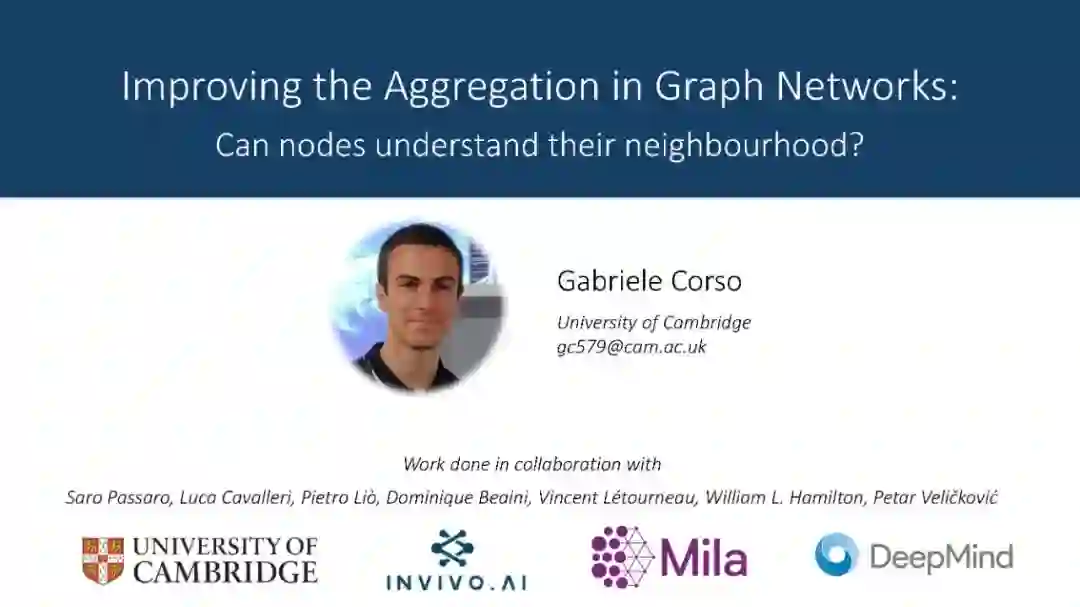 图神经网络已被证明是对图结构数据的不同预测任务的有效模型。本次演讲将结合主邻域聚合(NeurIPS 2020)和有向图网络(在NeurIPS 2020的DiffGeo4DL研讨会上发言)的研究。我们将检查图神经网络的表达能力,显示当涉及到连续特征空间和定向核时的局限性。这些都将促使GNN的聚合方法得到改进,从而使我们能够全面泛化CNN。来自分子化学和计算机视觉基准的实证结果将验证我们的发现。