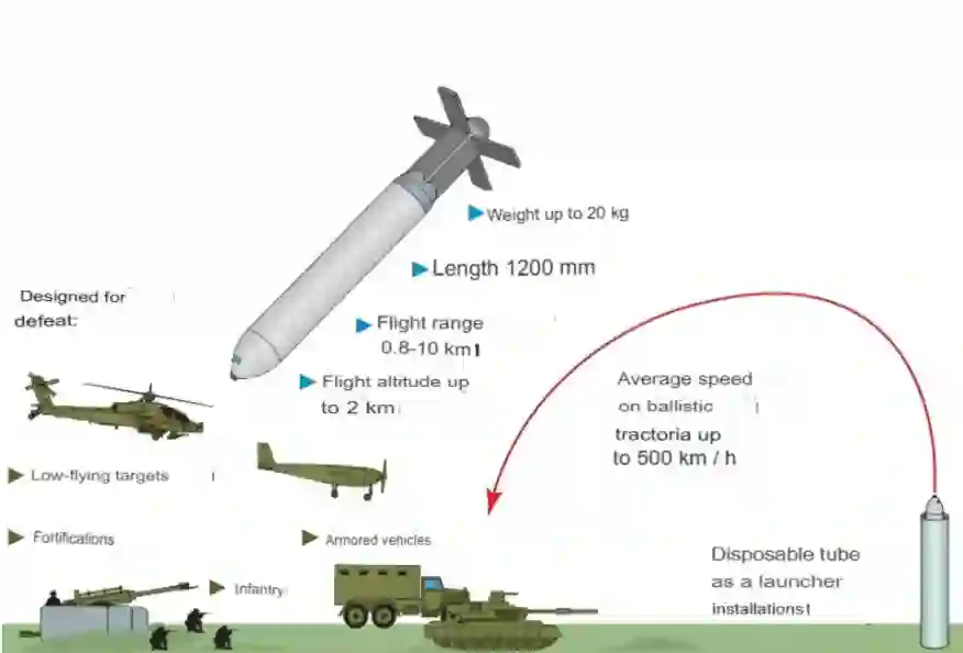 图:"索利斯特"导弹填补迫击炮与反坦克导弹之间的作战间隙,具备下落阶段主动制导能力。弹体长1.2米,重20公斤,火箭发动机驱动下可达500公里/小时飞行速度,最大射高2000米并具备弹道修正能力(图片源:塔斯社新闻)。