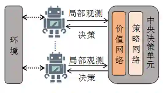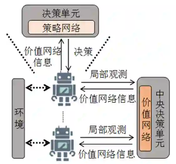 图7 全通信集中决策架构 全通信自主决策架构如图8所示。中央决策单元只训练联合价值网络,并将价值网络的输出反馈给各智能体的本地决策单元,每个智能体均拥有独立的策略网络,为了提高训练时决策的准确性,各智能体间通过通信实现信息交换并整合得到全局的信息,以此做出最优决策,当训练完成后,智能体通过本地决策单元进行决策。由于训练时采用了全局信息,已经包含了对其他智能体的推断信息,因此在本地决策时涌现出了协同合作的能力。该框架由于应用了本地决策,对通信时效性要求较低,在训练完成后减少了信息收集流程,因此得到了广泛应用。