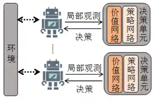 欠通信自主决策架构如图9所示。相比于前2种框架,欠通信自主决策架构放弃了对全局信息的整合,每个智能体拥有单独的价值网络与策略网络,训练过程中仅依靠自身的局部观测信息进行决策,以期涌现出协调合作的能力并最终完成任务。由于减少了通信流程,欠通信自主决策架构可以适用于任何一个多智体环境,但也产生了因信息缺失与观测噪声导致的不稳定因素。