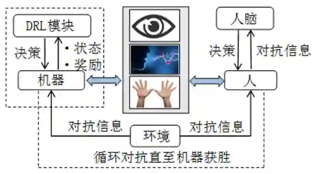 人机对抗与人机交互紧密相关,后者为前者提供了媒介,使得单独的人与独立的机器相互关联,为后续对抗研究提供基础;前者对后者进行评判与改进,可从众多交互方式中挑选出更合适且更高效的种类,并对此不断完善。特定环境中,人与机器可以通过语音、视觉和姿态等方式进行交互,环境将交互所得的对抗信息分别传递给人与机器。机器可与DRL模块进行绑定,DRL模块内嵌于机器中,在外界看来二者是一个整体,而在内部则进行了分化,机器将奖励和状态等信息传递给DRL模块,由其决策下一步的行动。 人类获得对抗信息后,经由人脑进行运算推理,并结合以往经验和认识水平等因素做出决策;将决策反馈给环境,环境对这些决策做出相应的推演与改变,即进行了一次人机对抗;在循环的对抗中实现机器对人类的超越,以及DRL模块对人脑的超越。