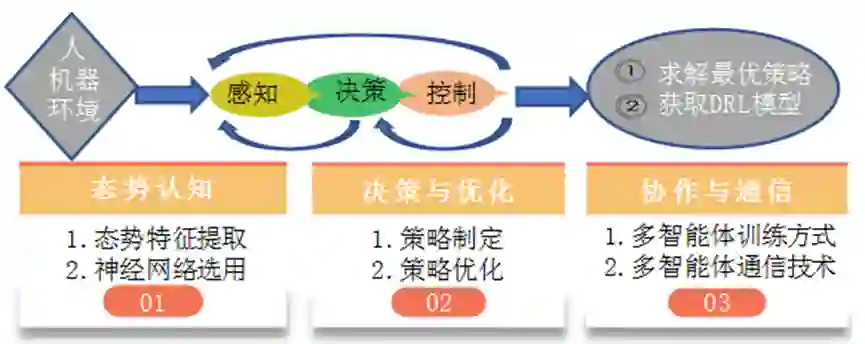 为了使人机对抗过程更具规范性、可解释性和推广性,美国空军上校John Boyd在20世纪70年代提出了著名的作战指挥模型,即将对抗过程抽象为感知-判断-决策-行动(OODA)环。黄凯奇等则将OODA环归纳为感知-推理-决策-控制,其中感知是对对抗态势的理解,推理是在感知基础上对态势进行预测分析,决策和控制是在感知与推理后下达策略指令,并进行方案的实施与调控。通过不断迭代整个决策环路,智能体的决策水平与对抗能力得以持续提升。DRL利用深度神经网络将感知与推理进行联合抽象,因此本文将基于DRL的人机智能对抗决策流程简化为感知-决策-控制,并将对抗技术归纳为态势认知-决策与优化-协同与通信,最终在迭代完成后得到最优策略以及训练好的DRL模型,为后续研究与分析提供参考。