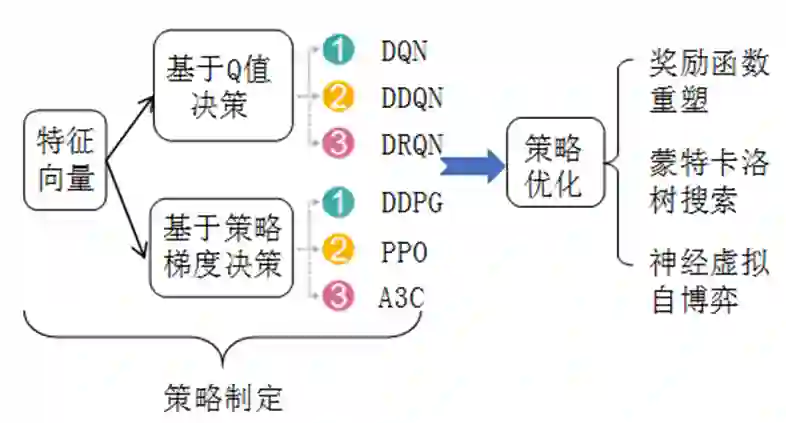 决策表明根据对抗环境信息与当前自身状态制定策略, 并选择合适的行动方案,具有实时性、时序性和反馈滞后性。智能体做出的决策均基于当前态势下的选择,且决策与决策之间拥有先后关系,而影响智能体决策的最大因素是反馈滞后,很多情况下只有在对局结束时才能得到反馈,不利于智能体进行学习和改进。 智能体做出的决策决定了对局走向,而决策质量则是影响胜负的关键。人类的决策具有主观性和片面性,带有经验主义色彩,通常只能在当前局势下取得一定优势,难以对最终胜利做出贡献。与人类决策相比,DRL实现了端到端的输出,通过神经网络直接给出决策结果,并通过对抗来优化网络参数,不断增强决策质量,提升智能体的决策水平。本文从策略制定和策略优化2个方面讨论智能体的决策。决策与优化如图4所示,其中,DDQN为双重深度Q网络;DRQN为深度循环Q网络;DDPG为深度确定性的策略梯度;PPO为近端策略优化;A3C为异步优势动作评价。