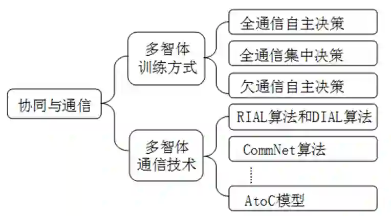 策略的实施离不开各个智能体之间的配合,为了应对复杂多变的对抗情形,智能体需学会协作,跳出局部最优策略的陷阱。星际争霸中,智能体们需要分工合作、共同完成建筑建造以及战斗配合等关键性战略任务,同时还需要对各自战场职能进行分类,实现行动细化,如让智能体在对战过程中根据各自角色进行战术配合,或在建造采矿方面学会有序合作。智能体们想要实现上述群体协同控制的目标,需要通过信息共享、资源交换和联合对抗等手段,但目前多智体协同仍面临智能体数量增多带来的状态空间与动作空间维数爆炸、智能体之间采取不同动作的相互影响以及个体利益与团体利益协调等问题。为解决上述问题,实现多智能体协同,本文对多智能体训练方式和多智能体通信技术2个方面进行分析。多智能体通信如图6所示,其中,RIAL为增强智能体间学习;DIAL可微分智能体间学习。