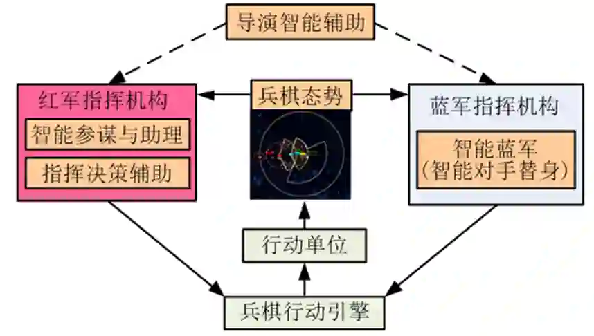 兵棋推演作为战争研究和训练的手段,正逐渐从早期的手工兵棋演变为计算机兵棋。图12给出了兵棋推演示意图。兵棋推演具有非对称性、随机性和高风险性。与星际争霸不同,兵棋推演的对抗双方实力不均等,如在夺控战中,红方兵力配置一般弱于蓝方,但红方在视野方面则拥有更多优势,并可使用远程飞弹打击,而蓝方则配备了更多的地面武装,拥有更强的进攻能力。 随机性与高风险性体现在游戏的判决规则中,如武器打击时存在偏离目标概率而导致打击失败,同时一方兵力受损后未进行弥补导致风险增加,可能会使一方直接溃败。为了改善兵棋推演面临的困境,文献将分布式执行集中化训练的AC框架引入了兵棋推演,并通过简化想定进行了验证;文献提出了一种层次化和模块化DRL方法框架,将网络压缩优化与迁移学习应用其中;文献提出了一种融合知识数据和强化学习的空战编组对抗智能决策方法,并在典型作战场景中对方法的实用性与可行性进行了验证。此外,中科院自动化所搭建了人机对抗智能门户网站,可实现兵棋的机机对抗、人机对抗以及人及混合对抗,同时发布了兵棋推演AI AlphaWar,并于2020年通过了图灵测试,促进了兵棋推演的智能化发展。2017全国首届兵棋推演大赛中,中科院自动化所研制的人工智能程序CASIA-先知V1.0,在“赛诸葛”兵棋推演人机大战中与全国决赛阶段军队个人赛4强和地方个人赛4强的8名选手激烈交锋,以7∶1的战绩大胜。尽管DRL在兵棋推演方面取得了不错的效果,但随着推演的进一步升级以及推演规模的不断扩大,现有算法将会受到状态空间巨大、收敛困难和局部最优等问题的挑战,因此需通过提高神经网络的感知力与算法鲁棒性来提升对抗水平。