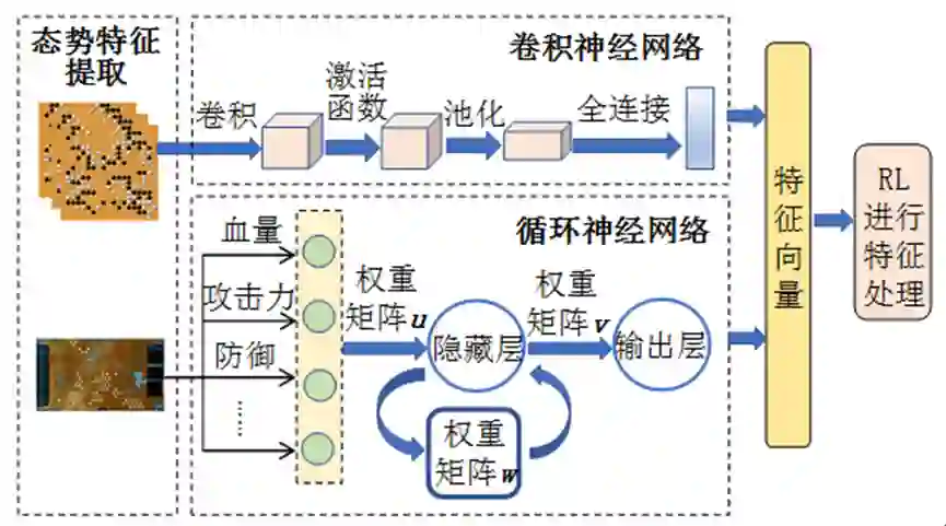 态势认知的概念是美国著名心理学家M. Endsley在研究飞行员空战任务时提出的,一般分为感知、理解和预测3个层次。朱丰等给出了联合作战背景下战役级作战态势的概念,虽然态势从广义来说包含了环境要素,但比环境要素多了许多看不见的信息,如战场态势中对抗双方的力量对比以及对敌方战略的预测分析等。 胡晓峰提出了态势认知速度将决定智能化作战的胜负的观点,未来的人机对抗将会是高智能的、高数量级的和高强度的。在这种情况下,人发挥的作用是有限的,如在AlphaGo与李世石的围棋对弈中,由于人脑的感知限制,使人对棋盘局势和棋子走向的预测始终存在局限性,充满了主观色彩,这说明人类难以胜任复杂的感知活动。而AlphaGo凭借监督学习和强化学习生成的策略网络,对棋局表现出了强大的感知力,获得了超越人类的棋感,最终以4:1战胜李世石。因此,为了加快认知速度,态势认知必然会向着智能化方向发展。本文将态势认知分为态势特征提取和神经网络选用2个步骤,而最终得到的特征向量则是DL对态势的一种抽象认知。态势认知图如图3所示。