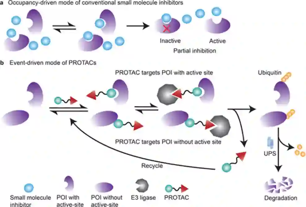 PROTACs是一种异双功能分子,含有一个与靶蛋白结合的配体和一个E3泛素连接酶的共价连接配体,通过泛素蛋白酶体系统降解蛋白质靶标。事件驱动的行动模式使PROTAC具有直接使目标蛋白降解的优势,而不是像传统的小分子抑制剂(SMI)依赖靶标的活性位点。由于其催化作用模式,PROTAC可以在低剂量下获得高效率,并与剩余的靶点再次结合(图2)。