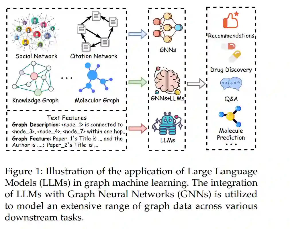 最近,大语言模型(LLMs)开启了人工智能的新趋势,并在自然语言处理(NLP)中展示了显著的能力。随着这些模型的发展,LLMs不仅被应用于语言任务,还在计算机视觉(CV)、推荐系统等各种应用中展示了巨大的潜力。LLMs在复杂任务中的有效性归因于它们在架构和数据集大小上的广泛规模。例如,拥有1750亿参数的GPT-3展示了生成类人文本、回答复杂问题和编程的激动人心的能力。此外,由于其庞大的训练数据集,LLMs能够掌握广泛的通用知识和复杂的推理能力。因此,它们在语言语义和知识推理方面的能力使它们能够学习语义信息。此外,LLMs展示了在有限或无特定训练的新任务和领域中的突出能力,这一属性预计将在不同的下游数据集和任务中提供高泛化能力,即使在少样本或零样本情况下也是如此。因此,利用LLMs在图机器学习(Graph ML)中的能力引起了越来越多的关注,并有望增强Graph ML,推动图基础模型(GFMs)的发展。