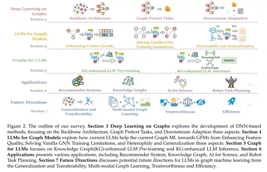 因此,在这篇综述中,我们旨在提供关于LLMs时代图机器学习的全面回顾。综述的大纲如图2所示:第二部分回顾与图机器学习和基础模型相关的工作。第三部分介绍了图上的深度学习方法,重点是各种GNN模型和自监督方法。随后,综述深入探讨了如何在第四部分使用LLMs来增强Graph ML,以及在第五部分如何采用图来增强LLMs。最后,第六部分和第七部分分别讨论了Graph ML在LLMs时代的一些应用和潜在的未来方向。我们的主要贡献可以总结如下: