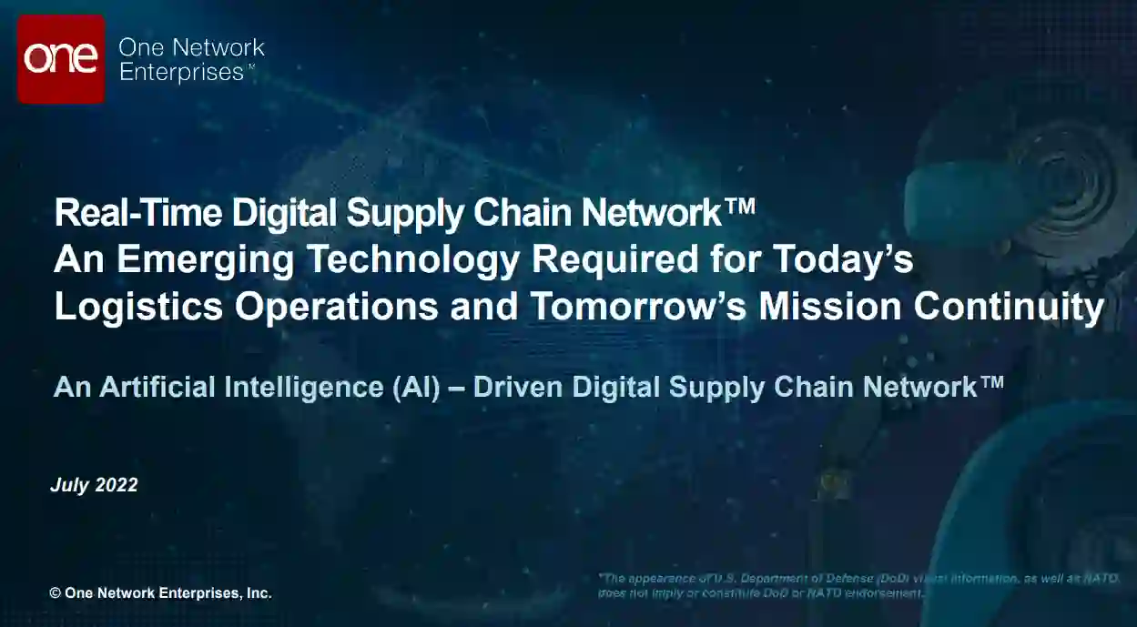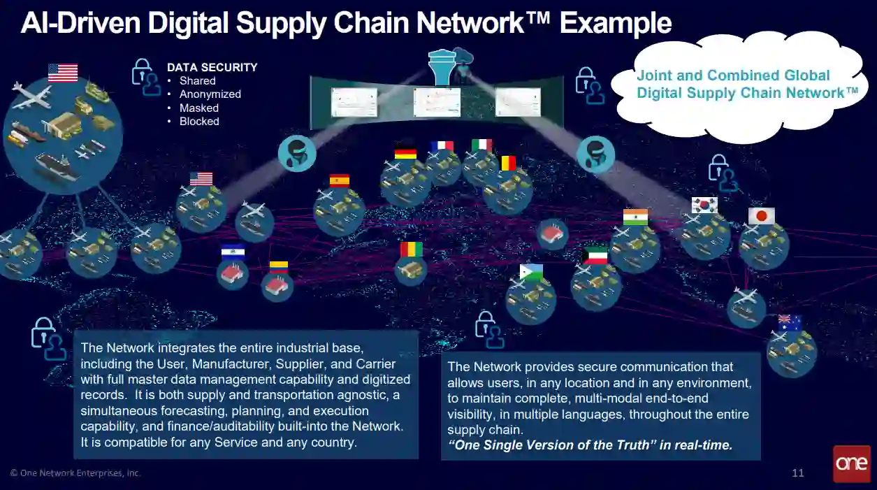 一个多语言的、具有外国军售(FMS)能力的、与供应和运输无关的解决方案通过我们的数字供应链网络™提供了一个 "SVOT"。它作为一个记录系统或参与系统运作,提供可操作的物流供应链可视性支持,以满足任务目标。结合断开的操作能力,该解决方案将提高军事行动的物流可视性。数字供应链网络™由ONE专有的AI/ML系统NEO驱动,是一个革命性的多方网络,是世界上第一个也是唯一的实时决策供应链套件。它使无限数量的贸易伙伴能够在网络上实时计划、执行、监控、同步和优化。该解决方案可以包容当前的系统,并优化它们的网络,以提高可视性和可操作性的协同作用。下图提供了数字供应链网络™功能的高层次视觉表现。