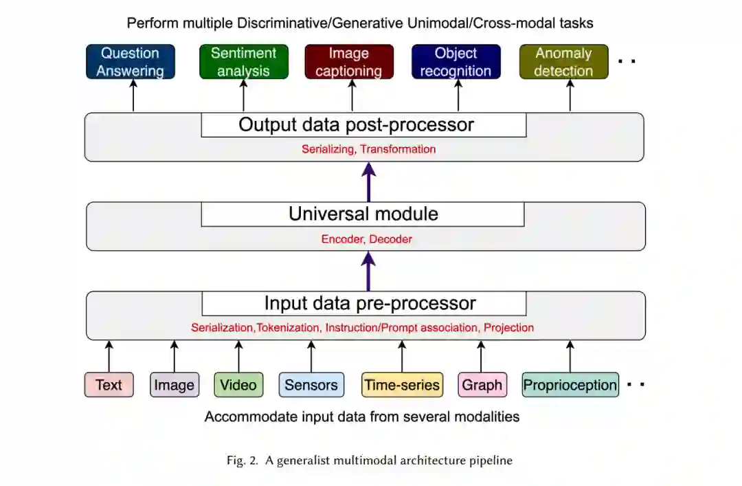 多模态模型被认为是未来人工智能进步的关键组成部分。由于基础模型在自然语言处理 (NLP) 和视觉领域的成功,这一领域正迅速发展,并涌现出大量新的设计元素。人们普遍希望将基础模型进一步扩展到多种模态(如文本、图像、视频、传感器、时间序列、图等),最终形成通用的多模态模型,即在不同数据模态和任务之间通用的单一模型。然而,关于最近的多模态模型(尤其是那些超越文本和视觉的模型)的系统性分析研究较少,特别是对于所提出的底层架构。因此,本研究通过一种新颖的架构和训练配置特定的分类法,提供了关于通用多模态模型(GMMs)的新视角。这包括统一性、模块化和适应性等对GMMs广泛采用和应用至关重要的因素。本文综述进一步强调了该领域的关键挑战和前景,并指导研究人员了解新的进展。