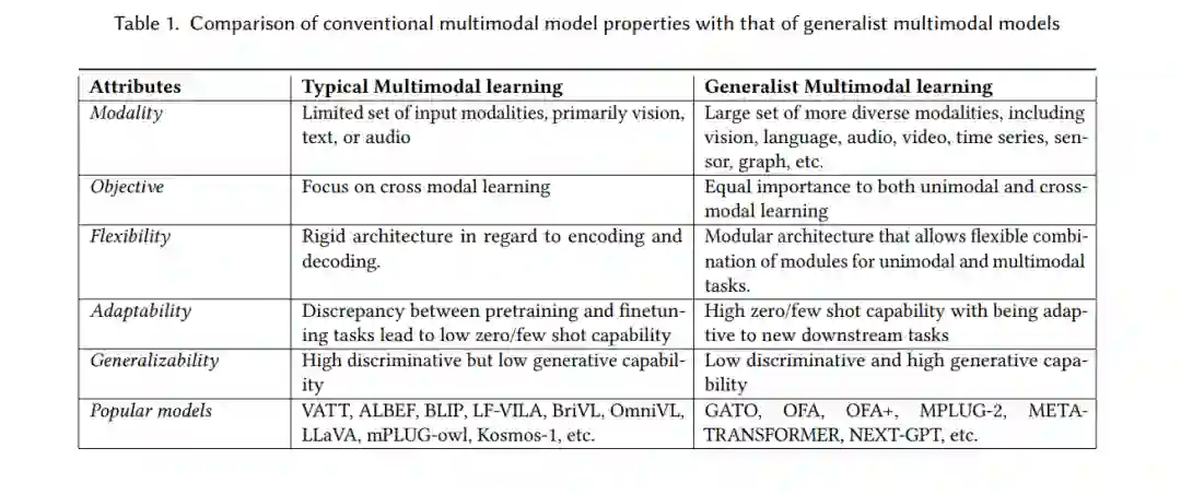 受这些差距的激励,多模态文献中引入了一系列新的设计元素【5, 58, 70, 84, 93, 106】。这些大多受NLP和视觉领域的单模态基础模型成功的启发。我们将这类新模型称为通用多模态模型(GMMs)。GMMs可以包括那些能够跨越研究中最常见的两种数据类型(文本和图像)之外的模态运行的模型。更具体地说,模型必须展示跨越多种模态(包括但不限于文本、图像、语音、音频、视频和传感器)的能力。这一更广泛的定义捕捉了在不同模态中具有广泛泛化表示的模型。表1总结了我们对通用多模态模型和典型多模态模型的定义之间的详细区分。