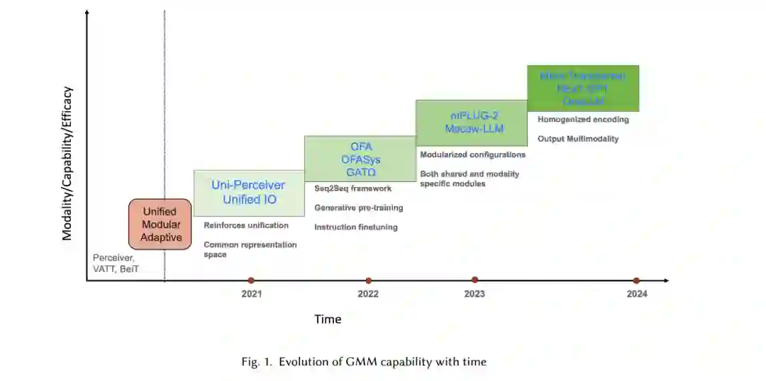 与标准深度学习模型相比,基础模型具有多种独特的属性,包括大规模预训练(监督或/和自监督,例如掩码语言建模【12】)和特殊的微调策略(例如,提示调优、参数高效微调)。这些基础模型的特性使它们在文本和视觉模态中成为领跑者【96】。这些特性也被引入GMMs,并在多模态学习中显示出类似的改进。另一方面,多模态学习在架构、训练策略和评估方面有许多方面,使得GMMs的发展成为一个独特的研究领域。如图1所示,GMMs的能力随着新策略的引入而不断增长。因此,审视当前GMMs的努力并确定进一步增强GMMs能力的必要属性具有重要价值。在本综述中,我们确定了这些新兴属性并进行了全面分析。