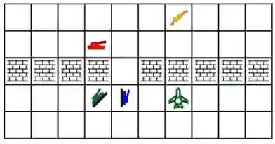 我们首先关注博弈论和兵棋推演之间的差距,在一个简单的突破场景中,这是兵棋推演中经常遇到的一个经典问题(例如,在桥梁交叉口、地雷区和山口[图8])。在经典的博弈论概念Brinksmanship("吃鸡")中,友好的蓝色和绿色坦克被激励着越过缺口到达另一边。通常情况下,这些坦克会协调他们的行动,但如果蓝、绿坦克之间的通信被破坏,一个单位(如蓝坦克)的行动可能会因为与另一个单位(绿坦克)的碰撞或友好射击而导致低回报。如果还包括囚徒困境的元素,那么这个场景就迅速超越了经典的博弈论,因为可能需要绿色和蓝色坦克一起穿越,共同攻击更强大的红色坦克,这需要仔细协调。额外单位的存在(例如,绿色飞机对敌对单位提供观察、轰炸或干扰,如黄色士兵提供可能的增援)能够进一步操纵动态和环境对决策的限制或机会。飞机也可能发现第二个缺口,或者 "墙"可以渗透,以创造缺口(例如,清除地雷或建立额外的桥梁交叉点)。