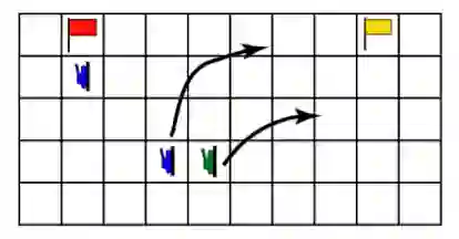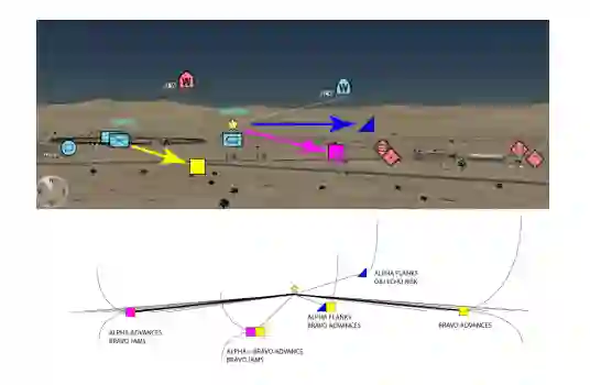 在ARL战斗空间游戏中,每个玩家都有一面彩色的旗帜,游戏可以通过歼灭所有对方的地面单位或夺取对方的所有旗帜来获得胜利(现实生活中的一个等价物是夺取所有关键的桥梁或指挥中心)。根据游戏的状态,指挥官可以决定改变整体策略(歼灭战与夺旗战),以更快地取得胜利。例如,如果一辆坦克已经接近一面旗帜,那么将剩余的单位转到其他地方寻找剩余的旗帜可能是有利的(图9)。相反,如果一支敌对部队守卫着第一面旗帜,那么优先夺取这面旗帜可能会更好,这样搜索第二面旗帜的效率会更高。这种未阐明的推理,或称 "默契推理",往往在自然的人类决策中根深蒂固,这是一种需要开发的人工智能能力,以便人工智能能够有效地参与人类-人工智能团队的决策,使人工智能的发展能够开始有工具来获得人类决策的创造性。