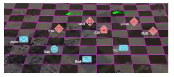 目前游戏玩法的实施很简单。最初,每个联盟(玩家)将其单位放在游戏盘的各自区域。当每队有多个联盟时,各队的游戏板部分被平均分配给各联盟。请注意,每个单位的位置对所有其他联盟都是未知的。然后,每个单位观察其可见范围内是否有其他单位,提供一个战争迷雾的场景。我们将每个单位的观察范围定义为从该单位的当前位置开始的一个方块;然而,可视范围可以根据场景和单位的情况进行定制。一旦每个单位观察到了,同一团队的联盟就会合作确定他们想为每个单位采取的行动集。这允许每个联盟观察其队友的单位位置,并进行沟通以协调他们的计划。接下来,每个联盟为每个单位选择一个行动。请注意,所选择的行动只有属于同一团队的联盟才知道。在选择了行动后,游戏决议被应用,根据他们选择的行动移动单位,并解决是否有任何单位被攻击或与另一个单位相撞。如果一个单位被攻击或与另一个单位相撞,它将被从棋盘上移走。这个过程不断重复,直到游戏结束。