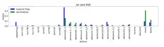 根据附录中的公式A-1定义,与图4和图5中的行动频率类似。然后我们将这个分布实现在两个简单的人工智能Agent中,并与两个随机Agent进行比赛。作为一个基线性能,我们与两个随机Agent进行了比较。在这两种情况下,都进行了1000场比赛,并计算了获胜百分比。通过使用双状态概率分布,简单的人工智能Agent能够在夺旗游戏中赢得84.5%的时间,在歼灭游戏中赢得76.9%的时间。