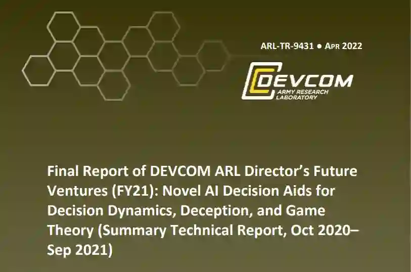 本报告描述了2021财年美国陆军作战能力发展司令部(DEVCOM)陆军研究实验室(ARL)未来风险项目 "决策动力学、欺骗和博弈论"的研究工作。为了提高指挥和控制多域作战的决策辅助工具的有效性,有必要开发能够协助复杂决策的人工智能(AI)工具。该项目开发了一个人工智能测试平台--ARL战斗空间(ARL Battlespace),用于创建和研究复杂推理的人工智能决策辅助工具。ARL Battlespace是一个由友好和敌对的人类和人工智能Agent组成的多人网络兵棋推演工具。分层贝叶斯模型的初步结果说明,在具有不确定性、欺骗和博弈论的情况下,具有复杂推理功能的人工智能多学科发展框架具有潜力。该项目还开始开发一个基于与战场可视化和交互平台以及高性能计算持久服务框架的潜在集成的人机协作决策框架。这些成果为改善人-人工智能团队的复杂决策和协作能力开启了研究的大门。