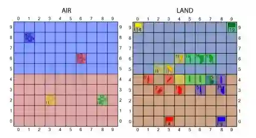 为了实现这些解决方案,我们开发了一个类似于国际象棋的棋盘游戏,由两支队伍组成,一支红色部队和一支蓝色部队,每支队伍可以有多个联盟(玩家)。游戏是在一个共同的战斗空间上进行的,这个战斗空间目前被设计为MDO每个领域的一套棋盘。图3显示了一组游戏棋盘的例子,我们考虑了一个"空中"和一个"陆地"棋盘。每个棋盘都被划分为一组单元格,"空中"棋盘被放在"陆地"棋盘上,形成一个共同的战斗空间。在这个例子中,我们选择了创建方形网格,并且只考虑两个领域。然而,在一般情况下,棋盘格可以采取任何形状,并且可以任意缩小,而棋盘的数量可以灵活处理MDO中的每一个域。例如,"空中"盘可以由多个代表不同海拔高度的板组成。这种提法提供了一个通用的应用编程接口(API),允许在兵棋推演中取得基本的研究进展,因为它可以被定制以适应任何兵棋推演的场景。