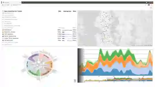 图16显示了SyncVis视觉分析系统,该系统旨在显示多个协调的数据分析视图,支持数据探索和理解。SyncVis通过用户互动将每个视图中显示的信息与其他视图联系起来,从而产生多种数据可视化。这个例子显示了SyncVis在四个协调视图中对COVID分类人群数据分析的二维界面。变量选择器(选择六个属性)、地图/地形、相互信息图和每个选定变量的叠加区域图。