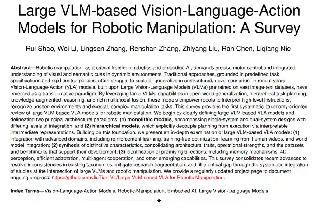 摘要—— 作为机器人学和具身智能的关键前沿,机器人操作需要精确的运动控制,以及在动态环境中对视觉与语义线索的综合理解。传统方法依赖预定义的任务规范和僵化的控制策略,往往难以在非结构化、全新场景下扩展或泛化。近年来,基于大规模视觉-语言模型(VLMs)的视觉-语言-动作(VLA)模型逐渐成为一种变革性的范式。这类模型利用大规模 VLMs 在开放世界泛化、层级任务规划、知识增强推理以及多模态融合方面的能力,使机器人能够理解高层指令、识别未知环境并执行复杂的操作任务。本综述首次从系统化、面向分类法的角度,对用于机器人操作的大规模 VLM 驱动 VLA 模型进行全面回顾。我们首先明确界定大规模 VLM 驱动的 VLA 模型,并划分出两类核心体系结构范式:(1)单体式模型,涵盖单系统与双系统设计,二者在集成程度上有所差异;(2)分层式模型,显式地通过可解释的中间表示将规划与执行解耦。在此基础上,我们深入探讨大规模 VLM 驱动的 VLA 模型:(1)其与强化学习、免训练优化、人类视频学习以及世界模型集成等前沿领域的结合;(2)其独特特征的综合,包括体系结构特点、操作优势,以及支撑其发展的数据集和基准;(3)未来的研究方向,包括记忆机制、四维感知、高效适应、多智能体协作以及其他新兴能力。本综述整合了近期进展,旨在弥合现有分类法的不一致性,缓解研究碎片化,并通过系统性地整合大规模 VLM 与机器人操作交叉领域的研究,填补关键空白。我们提供了一个定期更新的项目主页以记录最新进展:https://github.com/JiuTian-VL/Large VLM-based VLA for Robotic Manipulation。 关键词—— 视觉-语言-动作模型,机器人操作,具身智能,大规模视觉-语言模型