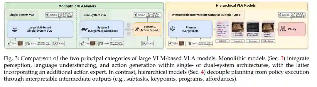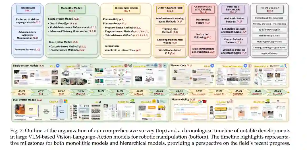 本文的主要贡献总结如下: * 纵向综述: 我们系统回顾了 VLM 的演化轨迹、操作学习的技术进展,以及大规模 VLM 驱动 VLA 范式的兴起。同时,分析了单体式模型与分层式模型的发展,识别关键挑战并展望未来方向。 * 横向综述: 我们提供了单体式与分层式模型更精细的比较性分类法,从结构与功能两个维度展开分析。进一步探讨了大规模 VLM 驱动 VLA 模型的前沿研究方向,强调其独特特征与支撑发展的数据集。该综述为理解该领域的发展与结构组织提供了概念性路线图。