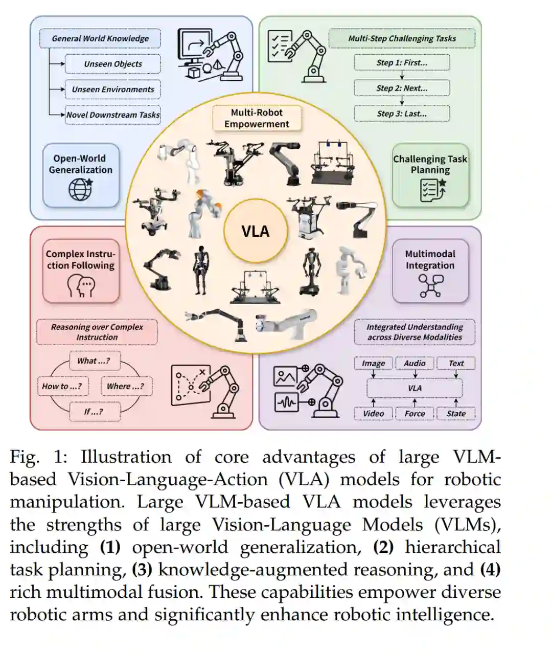 机器人操作(Robotic Manipulation)处于机器人学与具身人工智能交汇处的关键挑战 [1]–[5]。其实现不仅需要精确的运动控制,还需要对复杂动态环境中的多样化视觉与语义线索具备深刻理解。机器人操作在诸多领域展现出广泛应用价值,包括先进制造、高效物流、精准医疗和多样化的家庭服务 [6]–[8]。传统的操作方法 [9]–[16] 主要依赖精心设计的控制策略和严格预定义的任务规范。然而,这些方法在非结构化的真实世界场景中往往表现不佳——尤其是在面对新颖物体、模糊的自然语言指令或此前未见的环境配置时,暴露出其在可扩展性与泛化能力方面的固有限制。 近年来,大规模视觉-语言模型(Vision-Language Models, VLMs)[17]–[25] 崛起为一种变革性范式。基于大规模网页级图文数据集的预训练,大规模 VLM 展现出卓越的能力,能够弥合视觉感知与自然语言理解之间的语义鸿沟。这种创新能力使 VLM 不仅能结合文本描述理解复杂视觉场景,还能超越单纯的目标识别,形成整体的上下文理解。大规模 VLM 与机器人系统的结合催生了一类新模型:基于大规模 VLM 的视觉-语言-动作(Vision-Language-Action, VLA)模型 [26]–[32]。如图 1 所示,这一新兴范式展现出克服传统机器人流水线根本局限的巨大潜力。它使机器人能够理解高层次的人类指令、泛化至未知物体与场景、推理复杂的空间关系,并在动态、非结构化环境中执行复杂的操作任务。例如,一个 VLA 模型可以完成如下指令:“把红色的杯子从笔记本电脑旁边放到最上层的架子上”,这一任务需要视觉定位、空间推理与序列动作规划的复杂融合。 在本研究中,基于对近期工作的广泛回顾 [26]–[37] 及对该领域的深入理解 [38]–[43],我们提出了一个一致性的定义:大规模 VLM 驱动的 VLA 模型是指能够(1)利用大规模 VLM 理解视觉观测和自然语言指令;并且(2)通过推理过程直接或间接地服务于机器人动作生成的模型。我们进一步将其划分为两大类(见图 2 与图 3): * 单体式模型(Monolithic Models)(图 3 左):包括单系统与双系统实现。