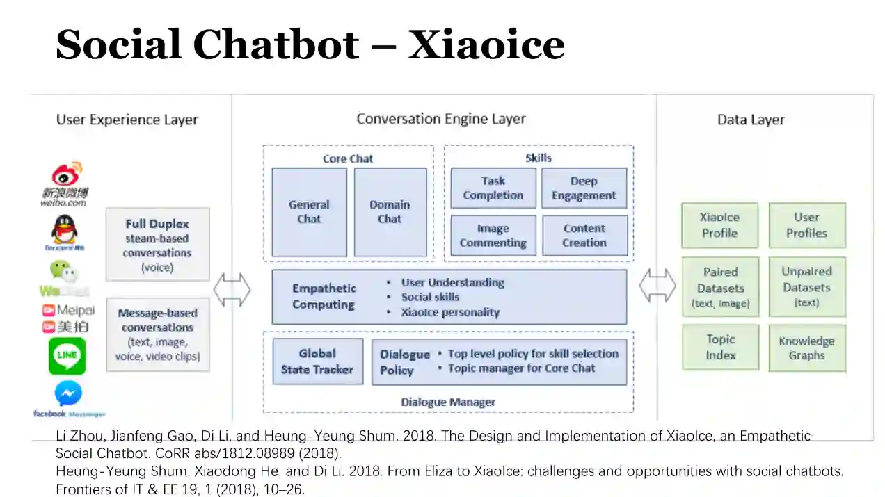 摘要:构建既有智商又有情商的社交机器人是人工智能领域最具挑战性的任务之一。社交机器人是一类混合的对话系统,其不仅具有信息获取、推荐、任务完成的智力能力,还具有情感交流、社会交往的情商能力,能够同时满足用户的信息需求与社会连接需求。报告人将重点围绕社交机器人中的语义理解、一致性、交互性等关键问题,对最新的学术前沿进行报告,并从知识、行为、情感、话题、人设、个性化等多个角度对社交机器人的前沿技术进行归纳和总结。
