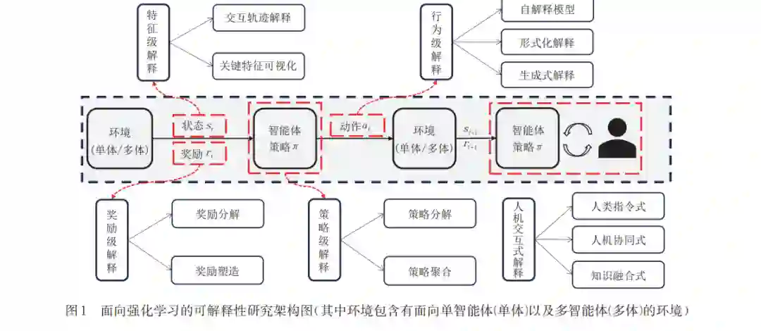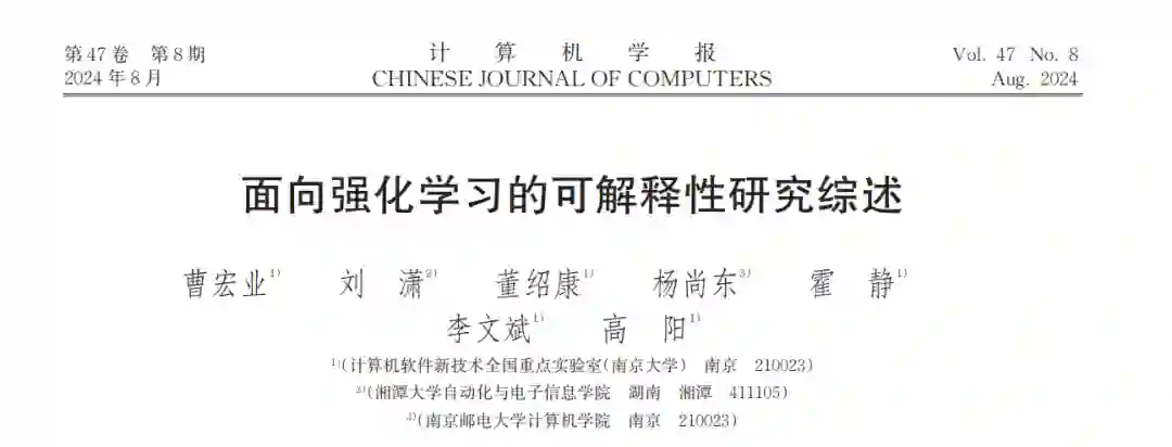 强化学习作为机器学习的一种范式,因其强大的策略试错学习能力,受到关注 .随着深度学习的融入,强 化学习方法在许多复杂的控制任务中取得了巨大成功.然而,深度强化学习网络作为黑盒模型,其缺乏可解释性所 带来的不安全、不可控及难理解等问题限制了强化学习在诸如自动驾驶、智慧医疗等关键领域中的发展.为了解决 这一问题,科研人员开展了对强化学习可解释性的研究 .然而,这些研究开展相对较晚,且缺少针对多智能体强化 学习可解释性方法的系统性总结,同时,可解释性的定义存在人为主观性,导致系统性面向强化学习过程的可解释 性研究较为困难.本文对当前强化学习的可解释性研究工作进行了全面的整理与总结.首先,对强化学习的可解释 性进行定义并总结了相关评估方法.随后,基于马尔可夫决策过程,划分了行为级解释、特征级解释、奖励级解释及 策略级解释四个类别 .此外,在每个类别中,分析了单智能体及多智能体的策略解释方法,并特别关注可解释性研 究中的人为因素,描述了人机交互式的解释方法.最后,对当前强化学习可解释性研究面临的挑战以及未来的研究 方向进行总结与展望.