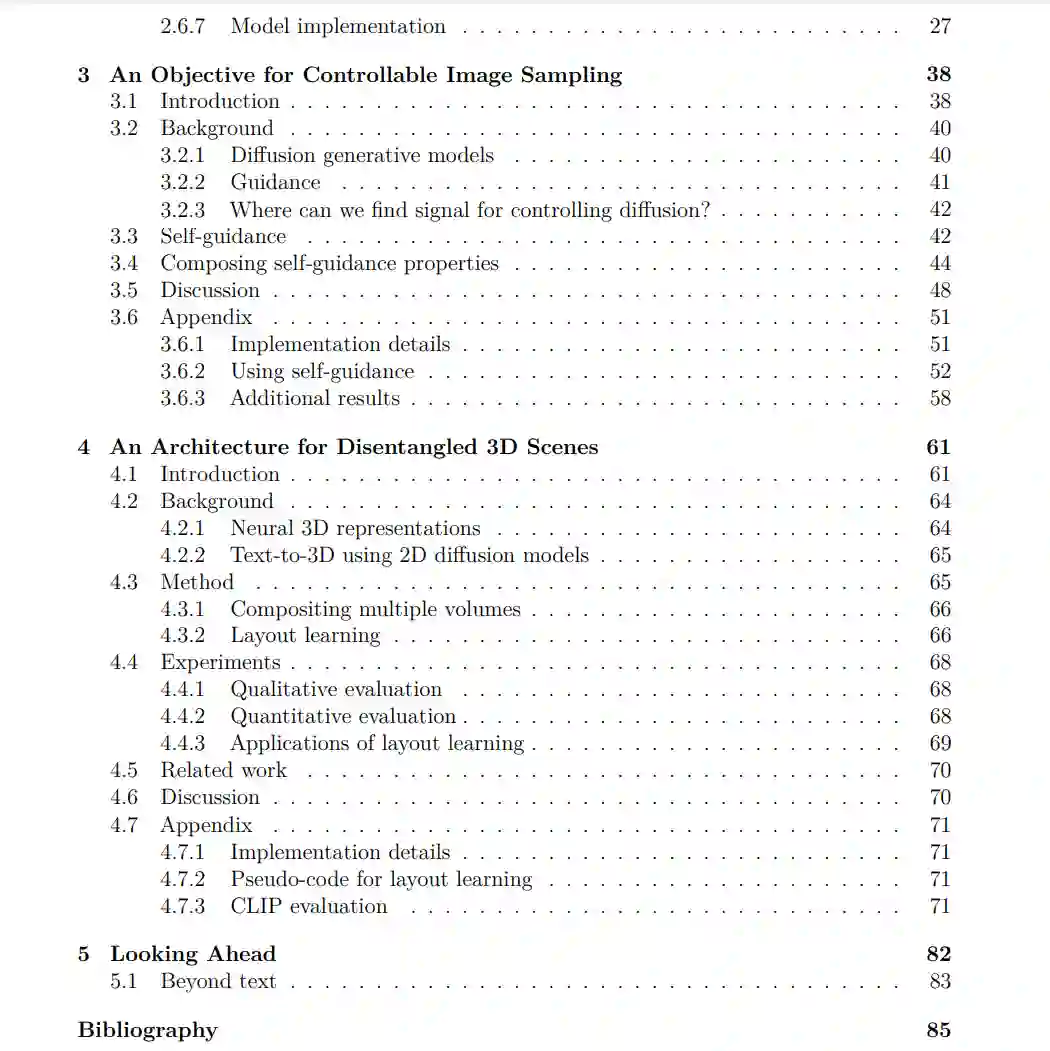 接下来,我考虑了在训练期间不对架构施加瓶颈的方法,从而使这些方法能够应用于更多样化、未经过滤的数据。我展示了扩散模型的内部可以被用于有意义地引导新样本的生成,而无需进一步的微调或监督。从去噪器激活的一小组原始属性中得出的能量函数可以组合起来,对迭代扩散采样过程施加任意复杂的条件。这使得能够控制任何可以用文本描述的概念的属性,例如位置、形状、大小和外观。 我还证明,文本到图像模型学习到的分布可以被蒸馏以生成组合性3D场景。主流方法专注于孤立地创建3D对象,而不是包含多个实体交互的场景。我提出了一种架构,在对其进行优化使其输出位于图像生成器的流形上时,可以生成分解为其包含对象的3D场景。这为模型仅通过2D图像观察到的世界推断实际3D结构提供了证据。最后,我以一个视角总结了涌现、控制、可解释性和规模之间的相互作用,并尝试将这些主题与对智能的追求联系起来。