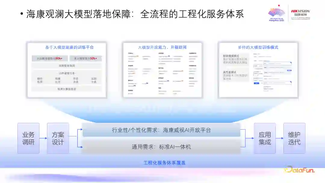 通过对从业务调研、方案设计,到应用集成、维护迭代的全流程形成标准化的工程化服务体系,为海康观澜大模型落地提供了保障。03****