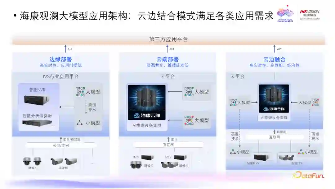 海康大模型采用了云边结合的模式进行部署,以满足各类应用需求。边缘部署,如二级分行会部署一些小模型,在智能 NVR、智能分析服务器等边缘设备上,负责处理本地数据,并在局部范围内进行数据分析;到省级分行,则使用大模型,利用大模型具备的自学习能力,根据不同环境进行模型的调优与优化。云端部署,采用了海康云眸,设备产生的图片会上传到云上进行训练、推理,以资源共享的方式,再下发到设备。这里的速度会不如边缘部署那么快。云边结合方案为各行业提供了灵活的部署模式,既能够满足数据安全的需求,又能够有效控制企业的资源成本。在金融行业中,边缘设备可以在本地完成实时监控和风险识别,而云端则为全局数据提供更深入的分析,确保了金融业务的高效运转。