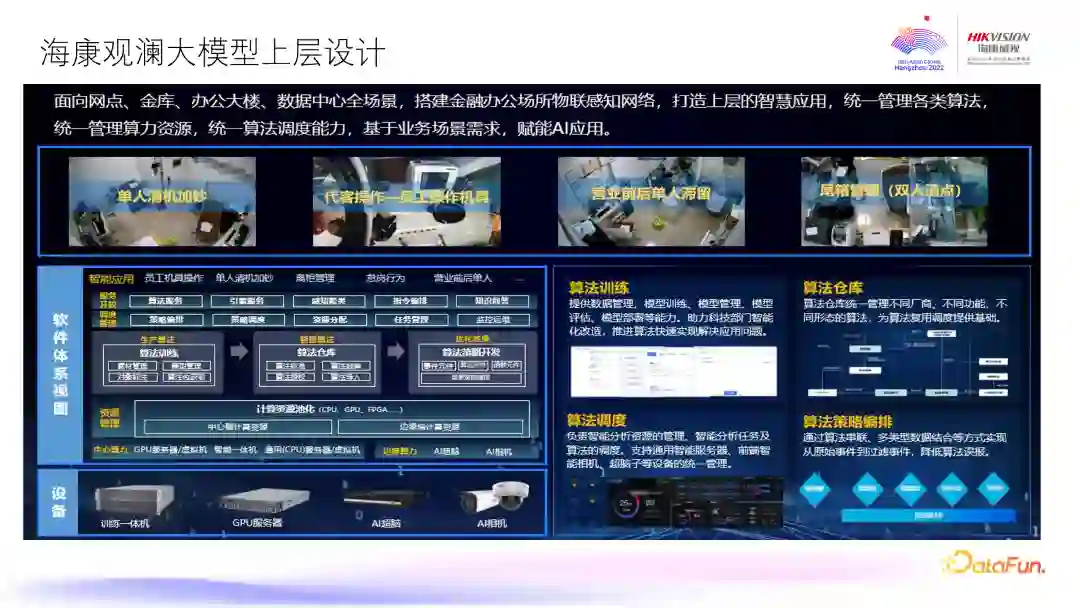 面向网点、金库、办公大楼、数据中心全场景,搭建了金融办公场所物联感知网络,并在此基础上打造了上层智慧应用,统一管理各类算法及算力资源,基于业务场景需求赋能AI 应用。