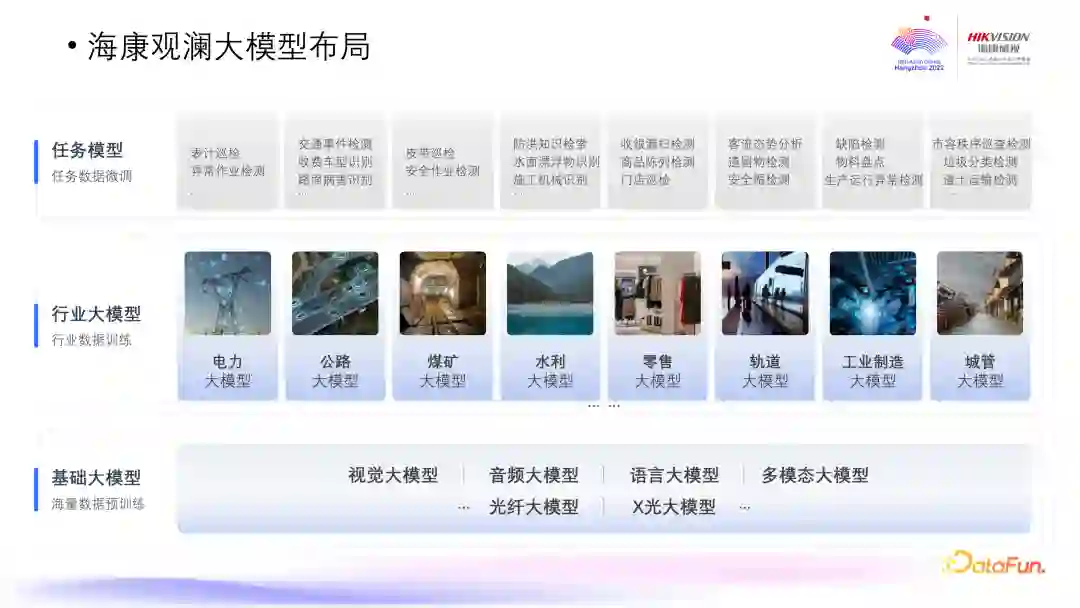 早期,海康基于海量数据预训练,构建了视觉大模型、音频大模型、语言大模型、多模态大模型等基础大模型。在此基础上又构建了行业大模型,广泛应用于电力、公路、煤矿、水利、零售、轨道、工业制造、城管、金融等各个行业。针对一些特定任务,又进行了模型微调,以满足具体应用场景的需求,如电力巡检、异常作业检测、交通事件检测、物料盘点、金融合规检测等。