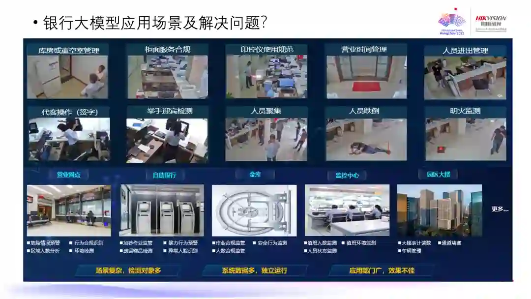 具体到金融行业,海康大模型主要应用于安防领域,涵盖人防、技防和物防三个方面。通过对银行网点内外的智能监控,实现了对人员行为的精确分析,如人员聚集、人员跌倒等。同时,大模型在金库和 ATM 加钞等场景中提供了高效的合规性监控,确保了金融资产的安全。通过大模型的持续训练和微调,海康大模型能够根据每个金融网点的环境特点进行个性化的优化,解决了传统安防技术在复杂环境下识别准确度低的问题。同时,大模型通过高度自动化的监控和管理手段,大幅降低了人力成本,为金融机构提供了更为智能化的安防解决方案。02****