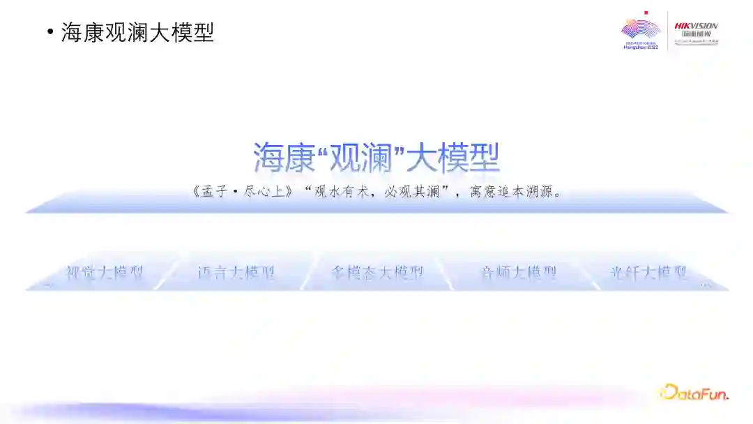 海康的大模型取名为“观澜”,源于孟子“观水有术,必观其澜“的哲理思想,象征着通过大模型的深度感知与洞察来实现对世界的全面理解。观澜大模型从视觉大模型起步,并逐渐扩展至音频、雷达、X 光等多个感知领域,形成了丰富的多模态感知基础,以适应不同的行业需求。