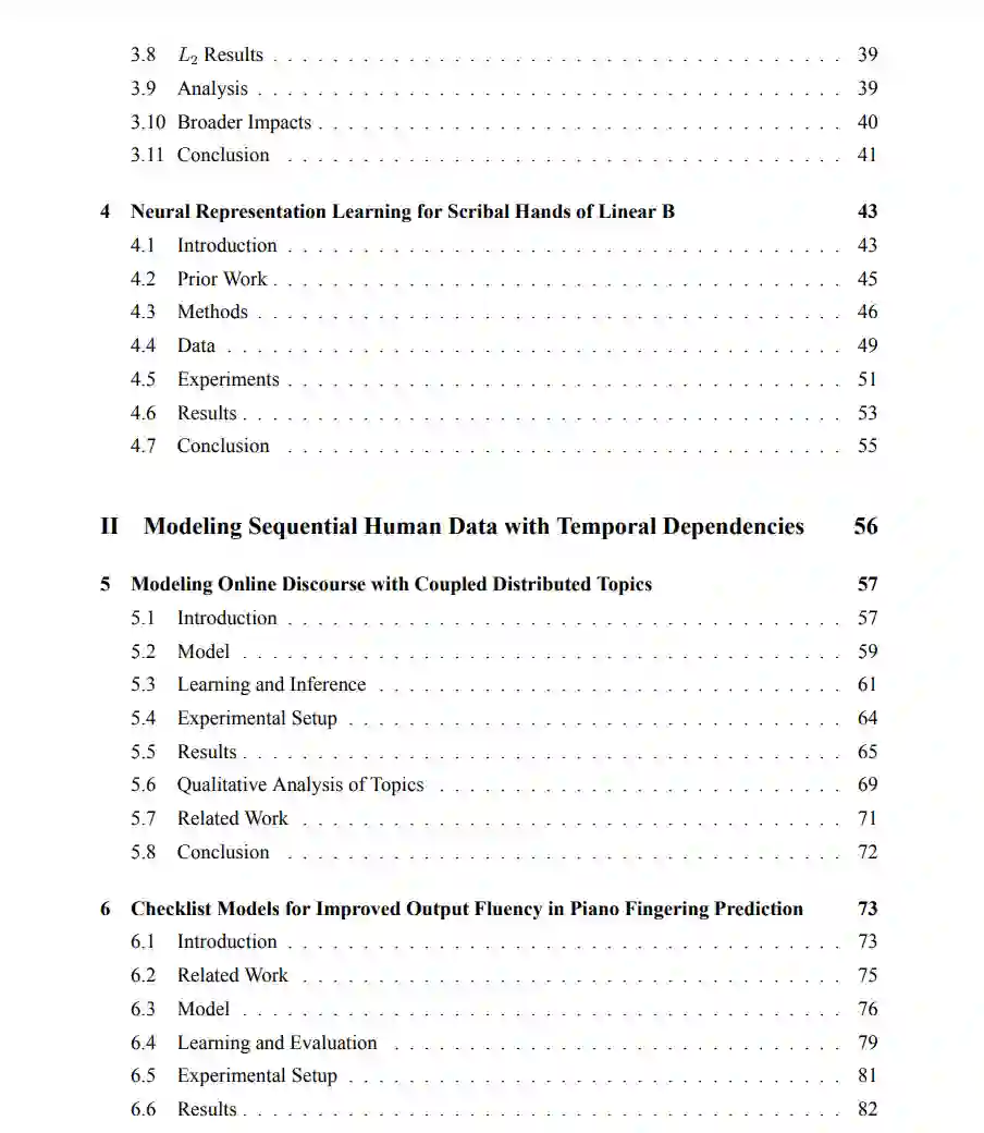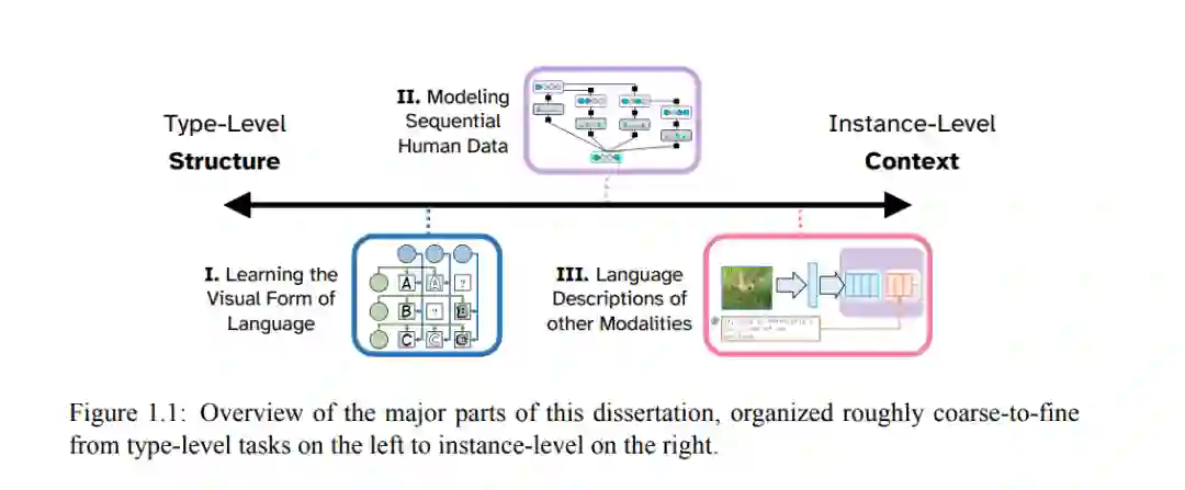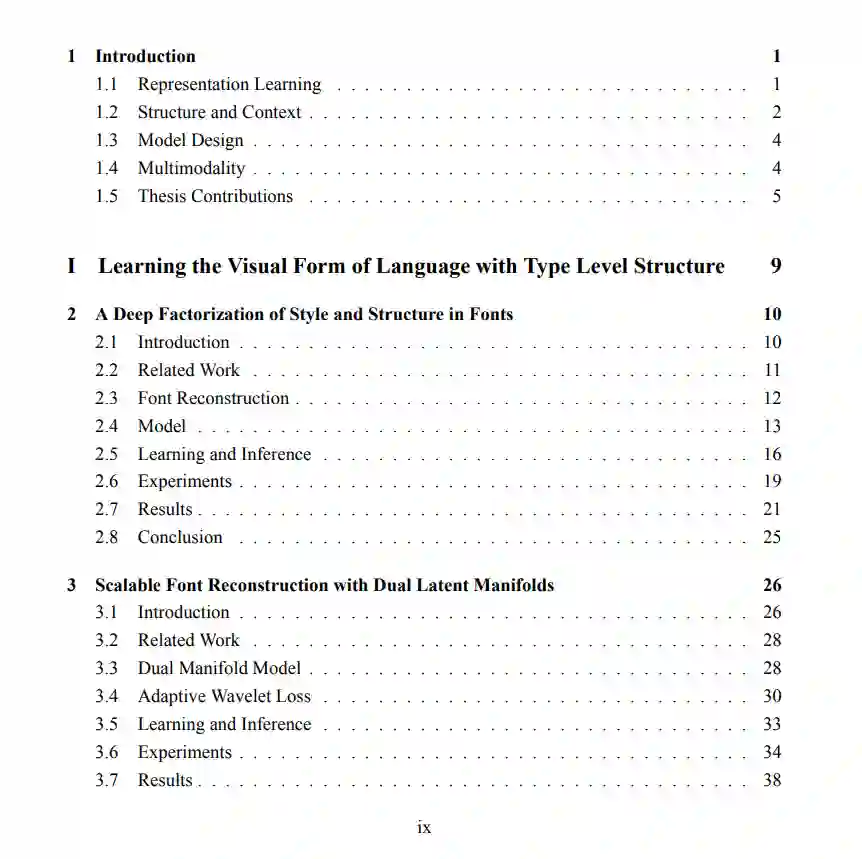 在从大规模语言数据语料库中学习表示时,一个普遍的策略是将该数据视为一系列独立同分布(IID)样本,这些样本相互独立地建模。虽然这种方法在某些方面是有益的,因为它允许通过随机梯度下降(SGD)进行高效训练,并且不依赖于可能并不总是存在的元数据,但它确实存在局限性。利用个别数据点之间更复杂的结构联系可以让信息在我们的语料库内流动,使得学习到的表示更具上下文敏感性,并允许更多的参数共享,从而更容易泛化到未见类别的示例。在这项工作中,我们将把这一思想应用于各种设置——主要是那些处于语言和其他模态之间边界的设置——对于这些设置,现有的先前工作大多没有明确利用数据内的可观察结构,我们还将展示如何通过更低级的建模选择为我们的模型添加有用的归纳偏见。为了保持可解释性和控制性,我们将同时使用概率变分学习框架和非变分方法(如检查列表模型和检索引导生成)来做到这一点。这篇论文分为三个部分,将这一广泛主题应用于各种具体应用。首先,我们将检查在数字字体中学习风格和结构的解耦表示的任务,然后将类似的建模思想应用于分析线性B文手写风格的任务。在下一部分,我们将探索学习时间排序数据的上下文化表示的方法,其中一个数据点的预测可能会影响附近的预测,例如钢琴指法估计和社交媒体上的话语主题建模。最后,我们将为输入信号本身是多模态的设置提出新的方法,例如为图像和音乐编写描述性标题的任务。