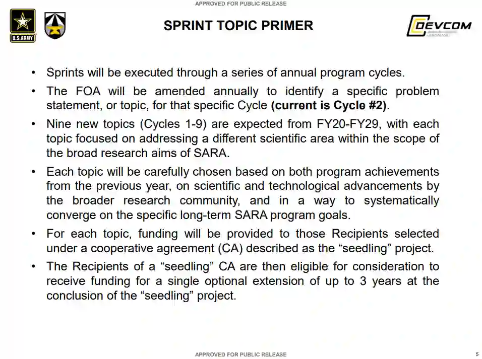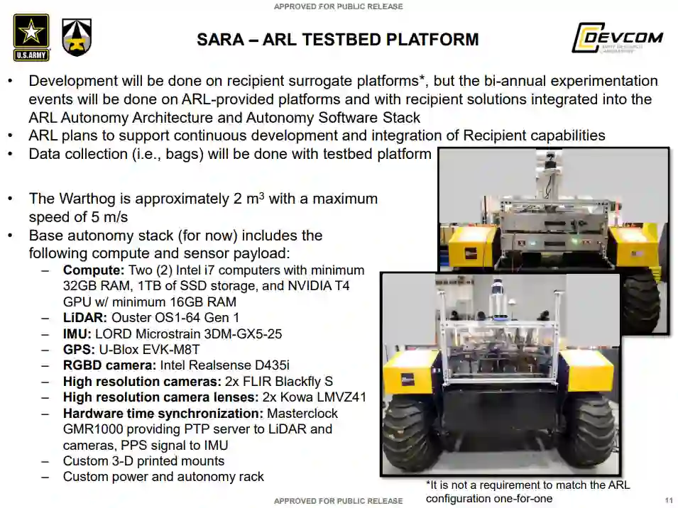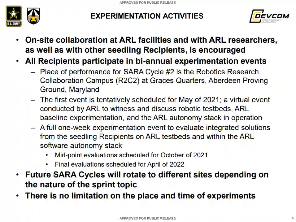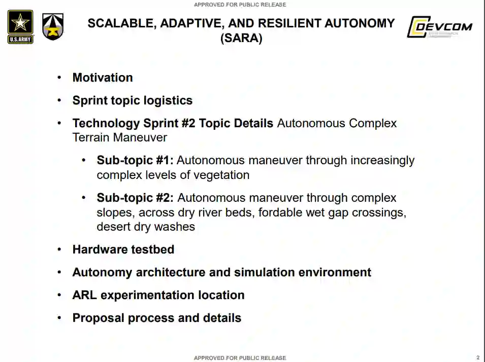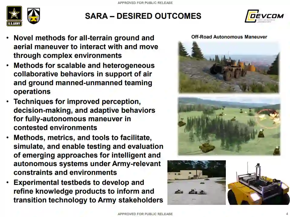 可扩展、自适应和弹性自主 (SARA) 协作研究联盟 (CRA) 专注于开发和实验加速自主移动性和可操作性、可扩展异构和协作行为以及人类智能体团队的新兴研究,以实现自适应和弹性智能系统可以对环境进行推理,在分布式和协作的异构团队中工作,并做出适时决策,以在复杂和有争议的环境中实现自主机动。