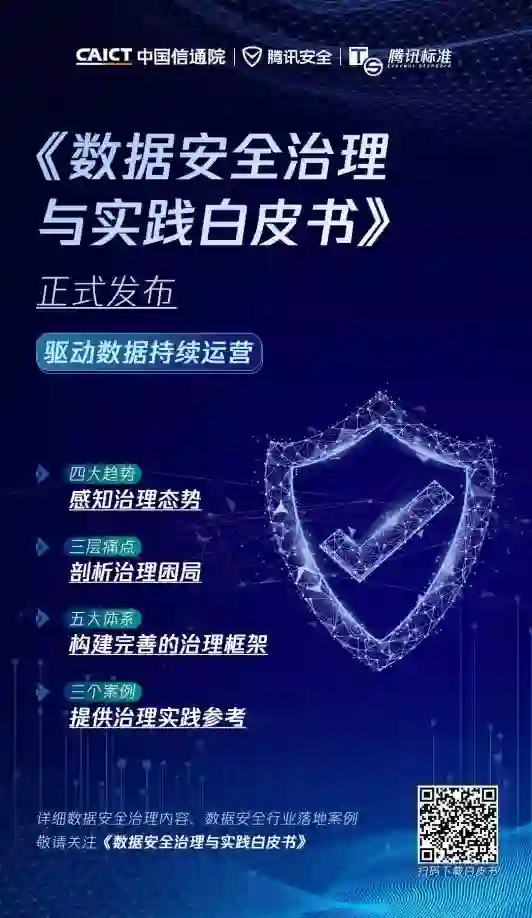其中,法律合规体系是腾讯数据安全治理体系框架的顶层保障,是企业在数据处理和管理过程中应遵守的法律法规和标准;组织保障体系是企业数据安全治理体系框架的重要支撑,需要遵循参与原则、责任明确原则、跨部门协作原则,以确保数据安全治理工作的高效运行;流程体系是腾讯数据安全治理体系框架的运行关键,流程体系细化整个数据安全治理的处理步骤,可以帮助企业更好落地;技术体系是治理体系框架的核心支柱,为保障数据安全而建立的一系列技术手段和措施;安全基础设施是数据安全治理体系框架的坚实基底。白皮书还分享了几例典型的数据安全治理实践案例供行业参考。随着企业生产驱动力的变革,企业的数据安全建设动力逐渐加强,越来越多的企业正在重视数据安全并采取措施加强数据安全治理。腾讯安全拥有大量基于自身实践和客户服务的数据治理经验,在数据分级分类、数据访问代理、机密计算、运维管控等关键领域有成熟的技术方案。腾讯安全致力于向行业输送前沿数据安全治理理念和实践方法论,为企业提升治理水平提供助益。