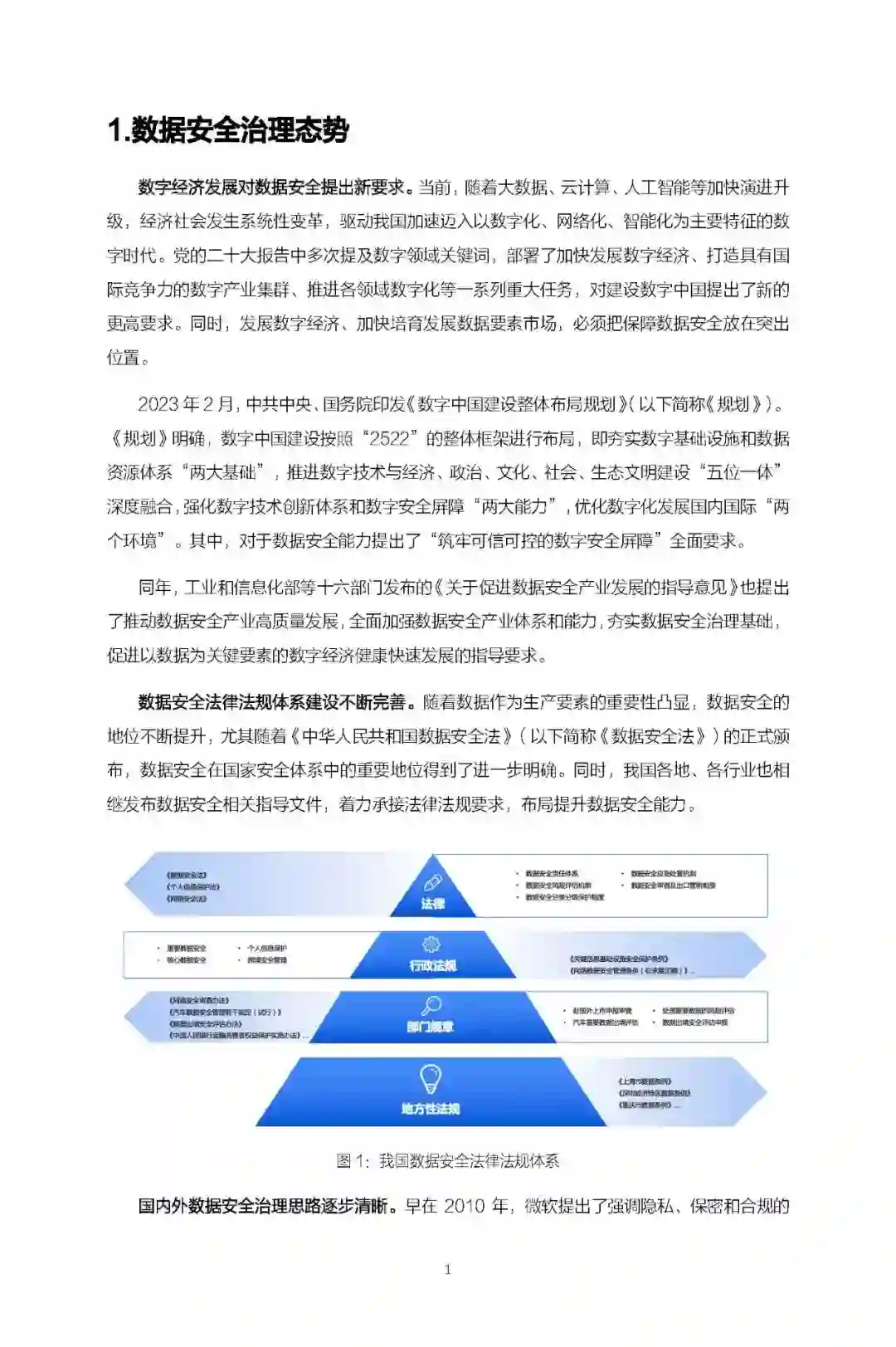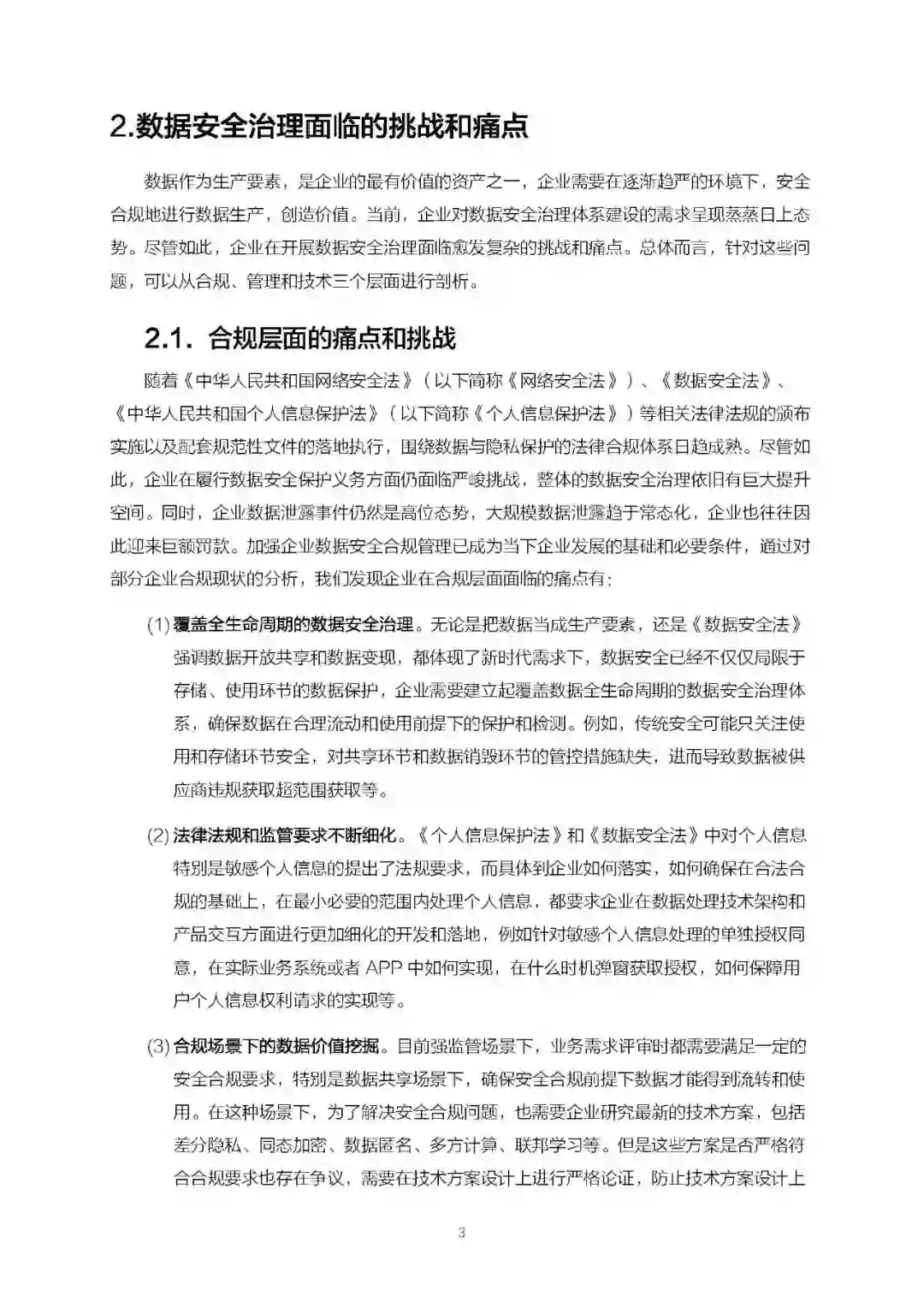 数据安全治理的趋势与困境数据作为一种新型生产要素,已成为企业重要资产和基础战略资源,数据价值的重要性不断凸显,数据安全问题备受关注,与之而来的数据安全治理也成为行业核心议题。白皮书指出,随着数字经济的不断发展,数据安全治理建设的需求显著提升。在数据安全监管要求逐步落地的背景下,各行各业组织数据安全建设的动力明显攀升,同时,数据安全单点技术的快速发展,带动了数据安全平台技术的萌芽,各种现象指明数据安全各项工作已进入蓄势阶段,企业对数据安全治理体系建设的需求正呈现蒸蒸日上趋势。但不容忽视的是,由于数据要素流通的复杂性、数据安全的主体责任边界模糊等问题,导致数据安全治理面临着一些痛点与挑战。通过分析信息技术的演进、监管和法规要求等,白皮书从合规、企业管理和技术三个层面深度剖析了数据安全治理过程中的困境。从合规层面来看,数据安全治理主要面临着覆盖全⽣命周期的数据安全治理难点、法律法规和监管要求不断细化、合规场景下的数据价值挖掘、数据跨境合规难题方面的痛点;从管理执行角度看,数据安全治理主要有数据安全责任落实难、数据安全管理模式落后、管理制度难以落地等方面的痛点;技术层面而言,数据安全治理的挑战主要体现在信息科技技术迭代的速度不断加快、企业在数据安全技术的选择相对有限、⼤数据时代带来的技术难题等方面。整体来看,数据安全治理需求日益凸显,但数据安全治理是一项长期而复杂的工作,且挑战诸多,企业需要进行综合全面的体系化建设来保障数据安全治理落地。五大体系“对症下药” 构建完善的治理框架李滨认为,数据遍布于企业生产、流通的各个环节,具有场景复杂、形态多样、体量庞大、新数据持续产生等特征,要想促进数据的持续运营,需要从流程制度、安全文化、技术手段等各个层面去保障实施。白皮书将数据安全治理体系框架分为五层:法律合规体系、组织保障体系、流程体系、技术体系和安全基础设施。