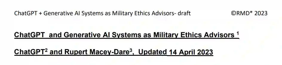 ChatGPT的广泛回应似乎表明,在不久的将来,ChatGPT和后续的生成性人工智能系统,特别是那些经过训练专注于军事道德问题的系统,应该能够提供急需的军事道德建议,自动检查所有军事命令,并通过语音界面系统等反馈给前线士兵,这将使战场上的军事道德行为得到显著改善,并可能减少违反军事道德和战争罪。推而广之,ChatGPT和后续的生成性人工智能系统也应该能够为政府领导人和将军们的非战场战略军事决策提供完全相同的支持。