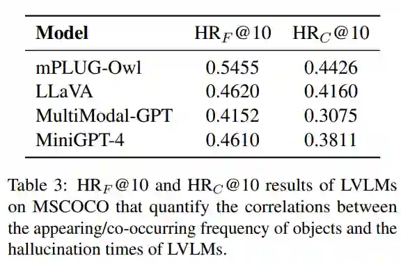 为了进一步定量分析这种现象,我们计算了频繁出现物体和所有幻觉物体之间的 Hit ratio@k ,以衡量它们间的一致性,其公式为: 其中是所有图像的总数,Hallucinated()表示在第张图中幻觉物体的个数,是幻觉物体中属于 MSCOCO 出现频率前k个的物体个数,从而能够反映频繁出现的物体占幻觉物体的比例。结果如下表左栏所示,几乎所有的 LVLMs 都在0.5左右,因此多模态指令数据集中高频出现的物体确实更容易出现幻觉。