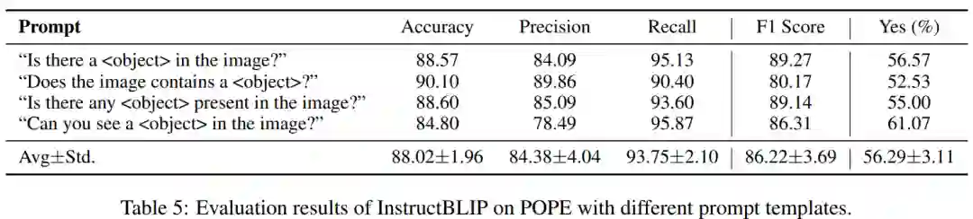 为了测试 POPE 的稳定性,我们还设计了另外3中问题模板,并在InstructBLIP上进行了测试,同时计算了其均值和标准差,结果如上表所示。可以看出 POPE 在使用不同问题模板的情况下各项指标变化幅度不大,较为稳定。