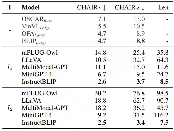 另外,我们还引用了一些较小的视觉-语言预训练模型 (VLPMs) 在MSCOCO上的物体幻觉结果,包括 OSCAR,VinVL,BLIP和OFA。