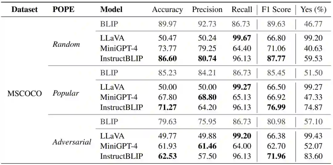 如上图所示,POPE 将幻觉评估转换为让模型回答一系列关于物体是否存在于图像中的判断题(例如'Is there a car in the image?')。具体而言,给定一个图像数据集和每张图像包含的物体标注,POPE将构造一系列由图像,问题和回答组成的三元组,可形式化表示为: 其中 表示图像,是待测试的物体,既可以是图像中真实存在的物体,也可以是自定义的不存在于图像中的物体,是测试物体 的问题, 是对该问题的回答('Yes' 或 'No')。 实验细节方面,我们将图像中真实存在的物体和不存在的物体之间的比例设置为1:1,并且使用二分类任务常用的 Accuracy, Recall, Precision 和 F1 Score 作为评测指标。此外为了更好的分析模型行为,我们还记录了模型回答 'Yes' 的比例。 关于图像中未出现物体的选择,我们受此前关于多模态指令数据对幻觉影响的分析启发设计了三种采样策略: