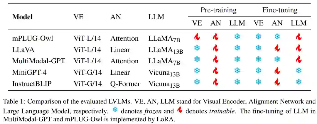 我们评估了5个最近提出的LVLMs,即MiniGPT-4,LLaVA,Mulimodal-GPT,mPLUG-Owl以及InstructBLIP。下表展示并比较了这些模型的结构和训练策略。