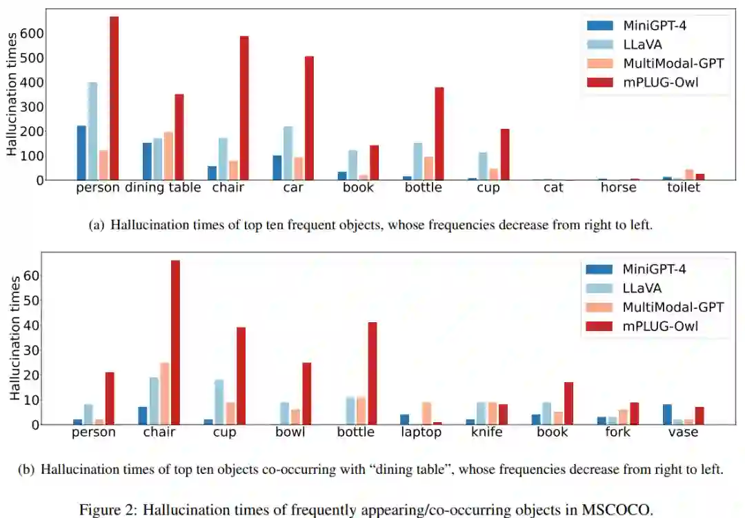 由于大部分多模态指令数据是在 MSCOCO 的基础上构造的,它们也可能继承了其中不平衡的物体分布,即部分物体频繁在数据中出现。因此在这些数据上微调后,LVLMs也可能倾向于生成这些物体。为了验证这一猜想,我们首先绘制了物体出现频率和幻觉频率的柱状图,如下图(a)所示。该图的横轴上的物体是在 MSCOCO 中出现频率最高的物体,并且频率从左到右依次降低。我们收集了MiniGPT-4, LLaVA, Multimodal-GPT和mPLUG-Owl在这些物体上的幻觉频率。从图中可以看出,幻觉频率基本从左到右依次降低,和物体出现频率的变化较为一致。因此 LVLMs 确实容易在频繁出现的物体上产生幻觉。