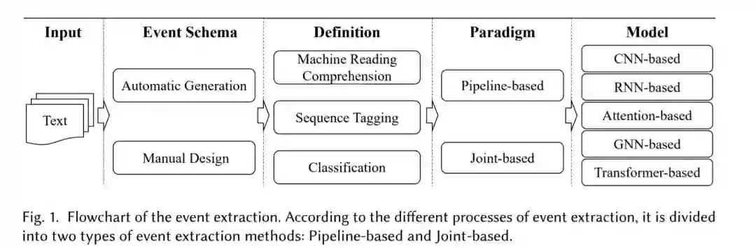 我们主要关注基于模式的事件抽取,它已经有了大量的工作,是一种比较成熟的研究分类。基于模式的事件提取从文本中发现事件提到,并提取包含事件触发器和事件参数的事件。事件提到是包含一个或多个触发器和参数的句子。事件提取需要识别事件、分类事件类型、识别参数并判断参数角色。触发器识别和事件分类可分为事件检测任务。参数识别和参数角色分类可以定义为参数提取任务。事件分类是一个多标签文本分类任务,用于对每个事件的类型进行分类。角色分类任务是一种基于词对的多分类任务,确定句子中任意一对触发器和实体之间的角色关系。因此,事件提取可以依赖于一些NLP任务的结果,如命名实体识别(NER)、语义解析和关系提取。