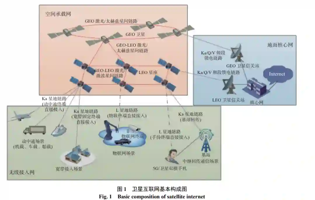 无人机(unmanned aerial vehicle, UAV)、无人 水面艇(unmanned surface vessel, USV)、无人水下 航行器(unmanned undersea vehicle, UUV)等无人装 备的快速发展, 使得无人装备跨域集群作战成为了 一种新型作战模式[1] , 在未来体系化作战中具有颠 覆性意义[2-3] , 将深刻影响和决定未来海战的成败。 近年来, 世界主要军事强国均着力加强水下无人 装备技术和应用部署等方面的研究, 积极推动水 下无人装备跨域自主协同作战能力发展, 为未来 海域无人集群作战积累技术和工程基础。2016 年 以来, 美国每年举办的“先进海军技术演习(ANTX)” 期间, 包括波音、海德罗伊在内的多家公司演示了 采用卫星、水声、超短波等多种通信手段以及中继 跨网互连方式, 来验证空海跨域网络的通信能 力 [4]。此外, 美国防部发布的《无人系统综合路线 图(2017-2042)》是 2001 年以来美国发布的第 8 版 无人装备综合路线图[5] , 旨在指导 UAV、UUV 及 USV 等无人系统的全面发展, 是在 2038年路线图 基础上的进一步延伸, 将无人系统更加深入地整 合到作战体系, 提升美军无人作战能力。国内针 对单作战域无人集群已有了较为完整的研究, 但 多作战域无人集群协同作战研究仍处于初步阶 段。江碧涛院士等[6] 对海空平台智能无人集群跨 域协同作战进行了深入、详尽的分析, 但暂未涉及 日益增长的水下无人装备作战需求。为适应未来 联合作战需求, 构建空域、海面及水下多作战域联 合跨域无人集群, 聚焦全域集群作战系统, 系统的 互操作性、自主性、安全网络及集群协同是加速无 人系统作战应用主要驱动力[7] , 通信组网是其基础 支撑能力。 当前地面互联网和移动互联网已非常发达, 但 仅覆盖地球表面的 5.8%, 卫星互联网发挥卫星及 互联网的优势, 可实现全球广域覆盖、万物互联和 随遇接入, 提供广覆盖、低延时、宽带化及低成本 的服务[8]。卫星通信受地形地貌、自然灾害影响 小, 适合为偏远、远海、境外及灾害应急等场景提 供服务, 具有重大的战略及经济价值[9]。借助卫星 互联网的全球广域宽带、低时延的服务能力, 可提 供基于卫星网络的空海跨域通信能力[10] , 有利于 提升跨域无人集群的作战能力, 同时, 将聚焦于单 作战域的传统无人集群作战系统相互贯通, 形成 由太空卫星、UAV、USV 和 UUV 组成的多作战域 无人集群网络, 对丰富作战战法、增强协同感知能 力、提升体系“云化”水平及加快智能迭代等具有 重要意义。
